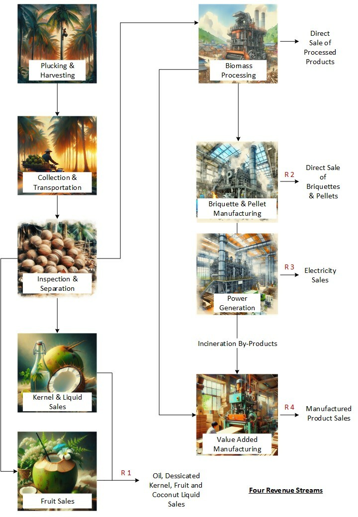 Alternatively, the coconuts can be processed into liquid and kernel, with the separation and collection of shell and husk which are then utilised for biomass power generation, or used for manufacturing.